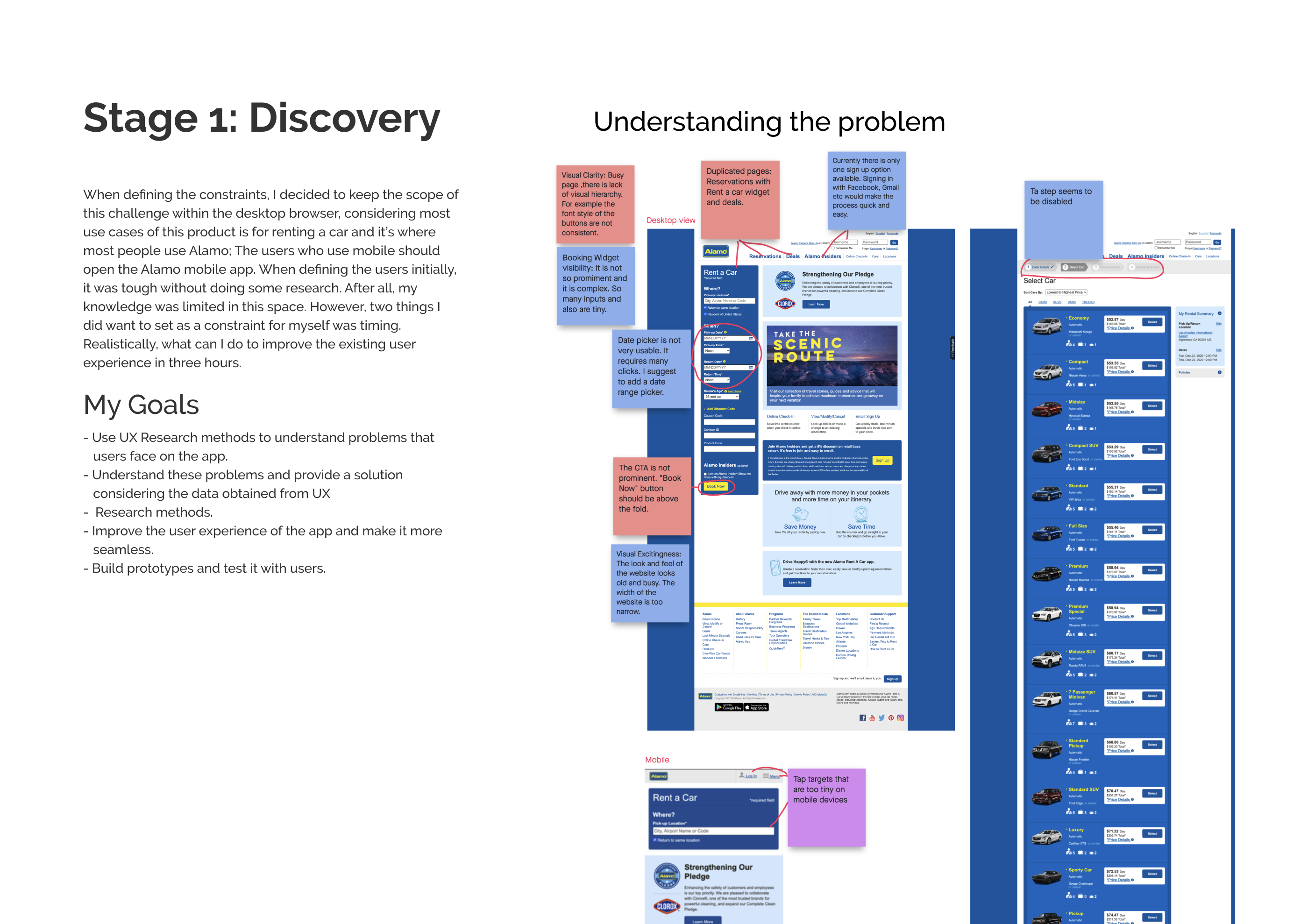 Alamo Rent a Car is a car rental agency in the United States. The goal of this case study was the re-design of Alamo website, and improve the user experience of the app and make it more seamless. I focused on the five-stage Design Thinking model. The five stages of Design Thinking, are as follows: Empathise, Define (the problem), Ideate, Prototype, and Test..