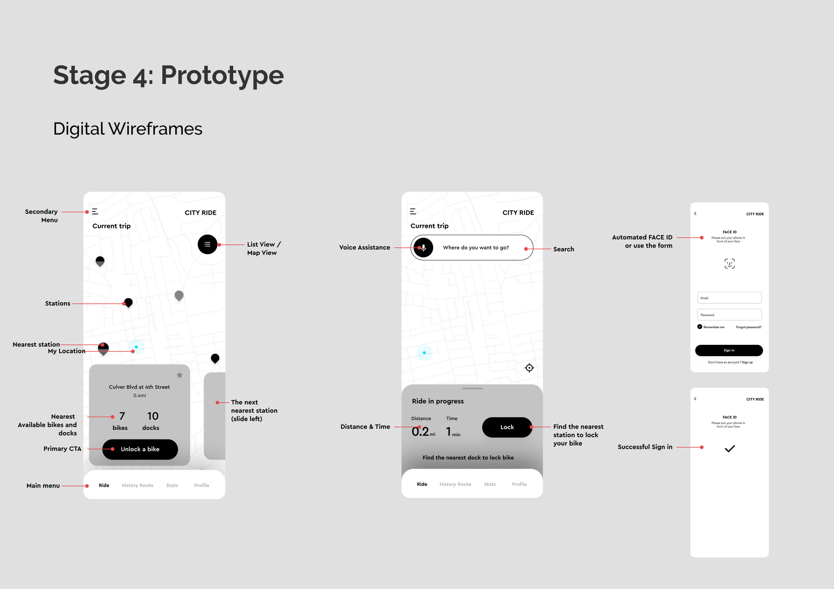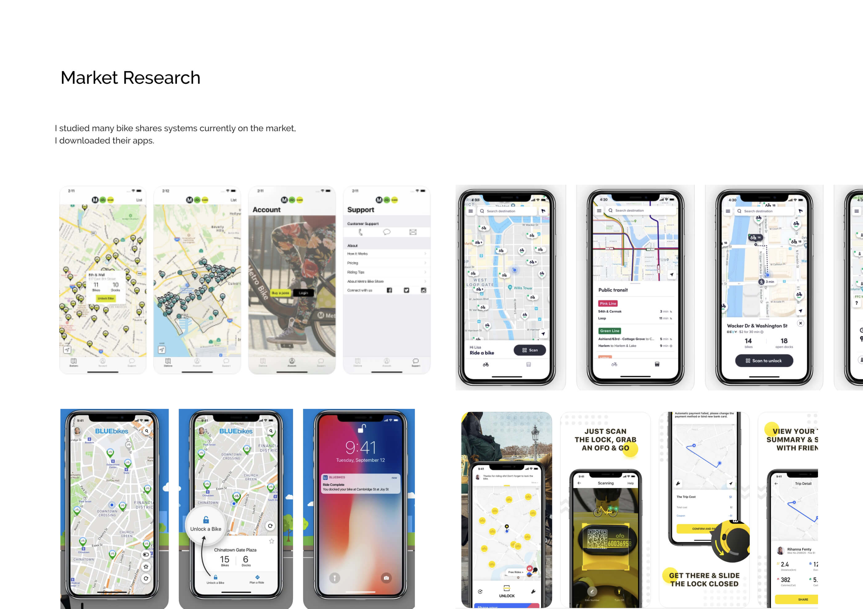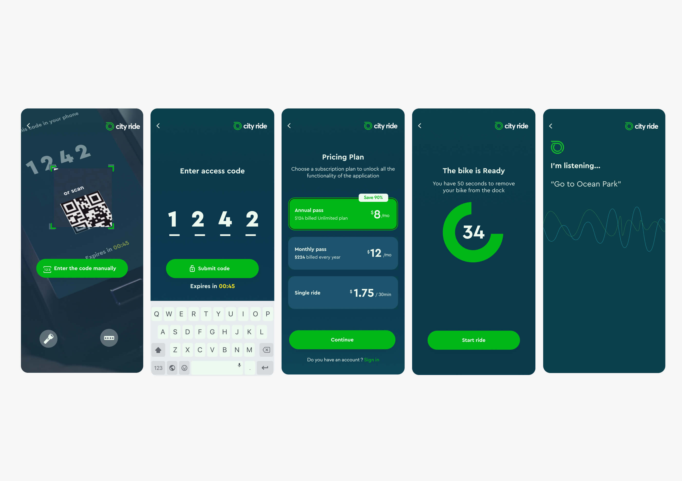 Designed the user interface for a subscription-based city bike service. The bikes are equipped with a pickup and payment dashboard, as well as multiple devices for payment. The system takes advantage of upcoming technologies -- voice recognition or face recognition -- or utilizes security ideas to reduce the number of steps required by the user to get on a bicycle.
